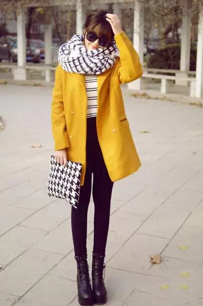 4、和黄色放一起比较好看,要注意黄围巾的尺寸。