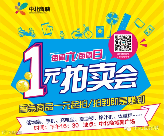 1元拍卖会是每周六日下午16:30开始,在中北商城南广场进行,来光顾的每个人都可免费参加“1元拍卖会”。现场近百余种超值商品全部一元起拍,各位微友!赶快行动起来吧!拍到即是赚到! (咨询电话:3868333) 点击查看“微官网”更多动态