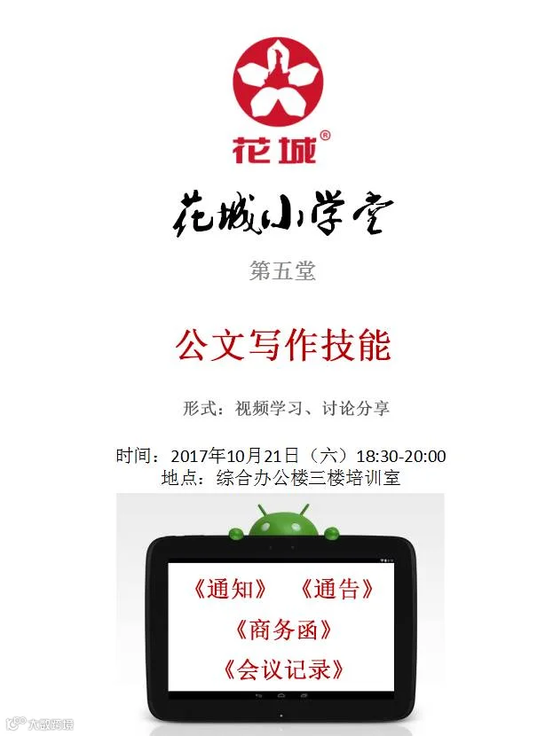 10月21日,花城小学堂又迎来了新的课程,本期主题是:“强化对写作能力的认识及提升公文写作的技能。”由于主题与办公室文员工作息息相关,办公室全体文职人员都积极参加。