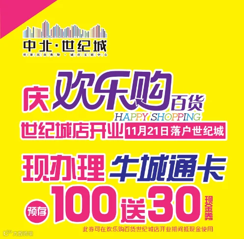 导读:为庆祝欢乐购百货世纪城店开业,现办理牛城通预存100元送30元现金券。还有更多优惠内容,请随时关注【中北世纪