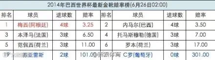 【金靴赔率:梅西秒爆内马尔】小组赛末轮,梅西梅开二度,阿根廷全胜晋级!一战过后,金靴赔率格局大变,梅球王1赔3强势登顶,大破“马字”定律,内马尔、本泽马和托马斯-穆勒“三马”眼看梅西一马当先!苏牙咬人惹祸1赔101,C罗至今没开张1赔301,望而兴叹..