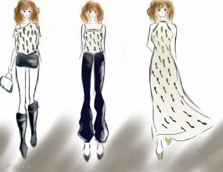 可以穿的衣服:短裙(裤)+中筒靴,紧身喇叭裤(大腿部位紧),长裙(全身/半身)。见图一。