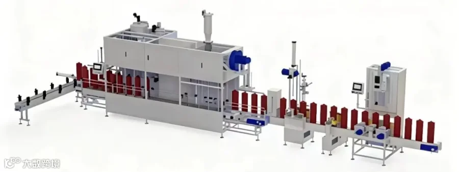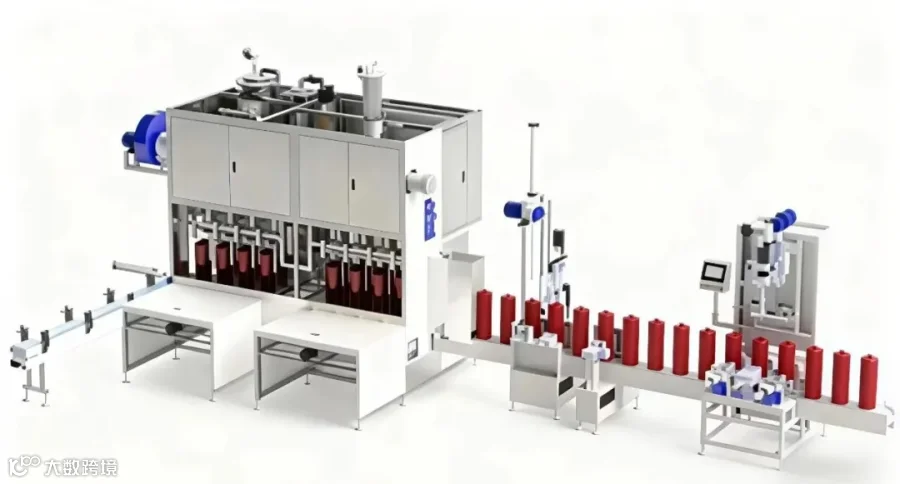 单色/双色丝印一体机、烘干贴标、自动码垛。