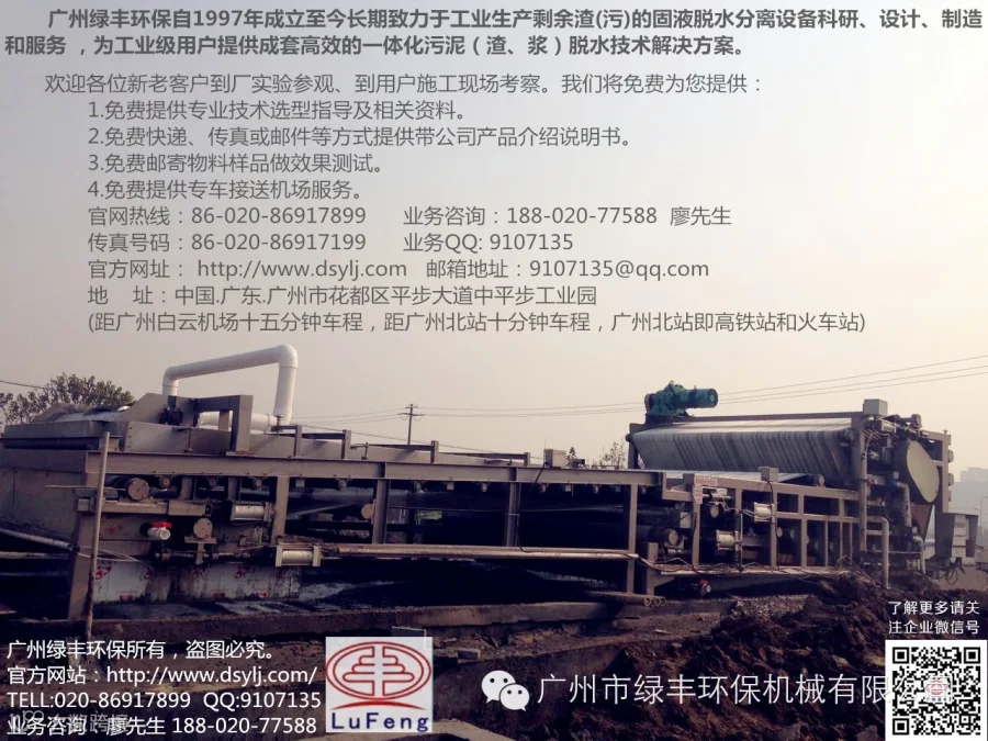广州绿丰环保自1997年成立至今长期致力于工业生产剩余渣(污)的固液脱水分离设备的科研、设计、制造和服务 ,为工业级用户提供成套高效的一体化污泥(渣、浆)脱水技术解决方案。