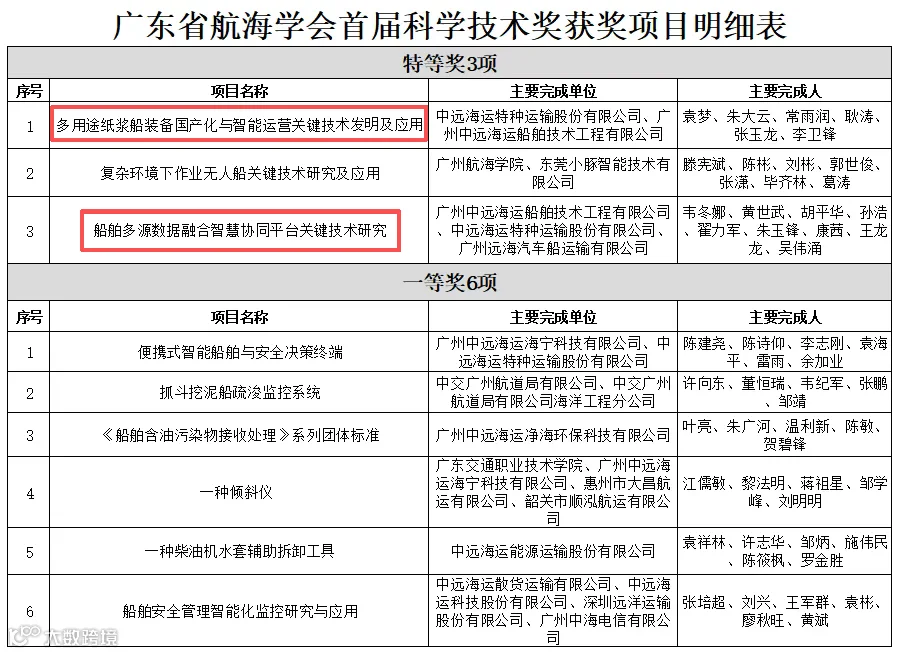 ——@广东省航海学会首届科学技术奖获奖项目明细表