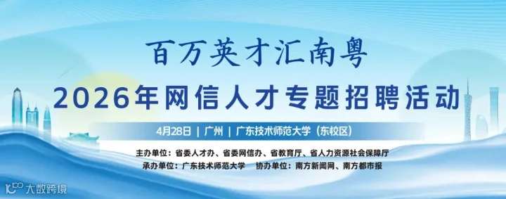 “百万英才汇南粤”2026年网信人才专题招聘活动,由省委人才办、省委网信办、省教育厅、省人力资源社会保障厅主办,广东技术师范大学承办,南方新闻网、南方都市报协办。