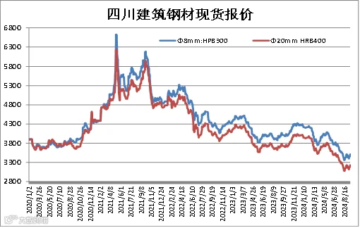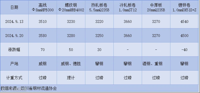 据四川省钢材流通协会对成都现货市场监测显示,本周建筑钢材价格继续上调,由于美联储开启降息周期,期螺走高对现货构成支撑,但下半周现货成交不畅。9月20日,成都地区Φ20mm HRB400螺纹钢价格为3280元/吨,较9月13日涨50元/吨;Φ8mm HPB300高线价格为3580元/吨,涨70元/吨。
