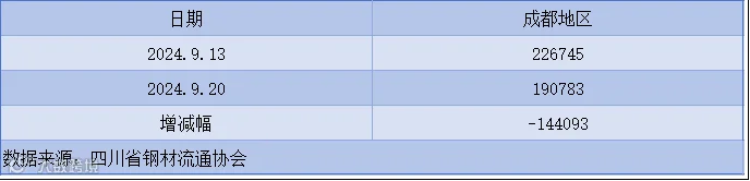 据四川省钢材流通协会统计,截止9月20日成都地区样本库房中螺纹钢及线材库存总量为190783吨,较上周减少35962吨,较去年同期减少144093吨。本期社会库存继续下滑,部分规格紧俏。