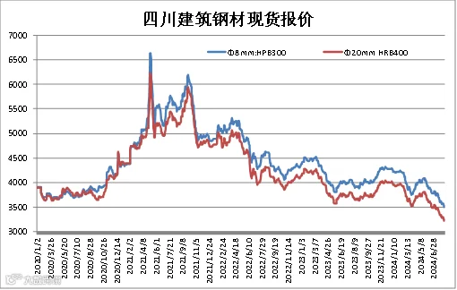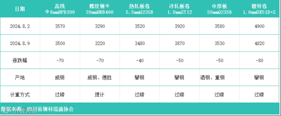 据四川省钢材流通协会对成都现货市场监测显示,本周建筑钢材价格延续下行,由于钢市低迷,终端需求表现一般,同时炉料疲软,成本端支撑进一步减弱。8月9日,成都地区Φ20mm HRB400螺纹钢价格为3220元/吨,较8月2日跌70元/吨;Φ8mm HPB300高线价格为3500元/吨,跌70元/吨。