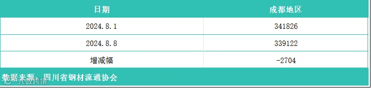 据四川省钢材流通协会统计,截止8月8日成都地区样本库房中螺纹钢及线材库存总量为339122吨,较上周减少2704吨,较去年同期减少74359吨。本期社会库存小幅下滑,由于西南区域钢厂减产,同时区域外资源到货减少。