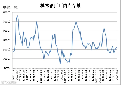 据四川省钢材流通协会对四家样本钢厂建筑钢材库存调研,截止8月8日,样本钢厂A和D较上周分别减少5800吨、8000吨;样本钢厂B和C较上周分别增加4410.256吨、7000吨。四家样本钢厂厂内总库存量为257202吨,周环比减少2390吨。