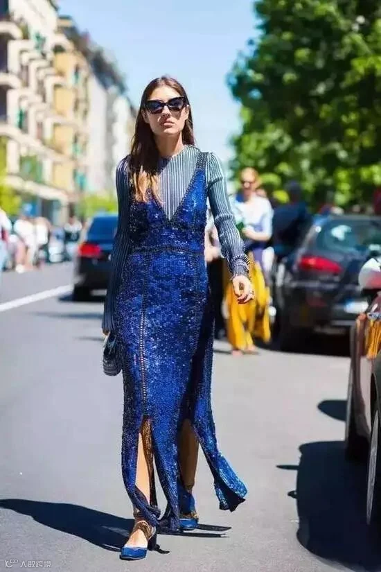 蓝色吊带裙和条纹衫叠穿,也可以很优雅,