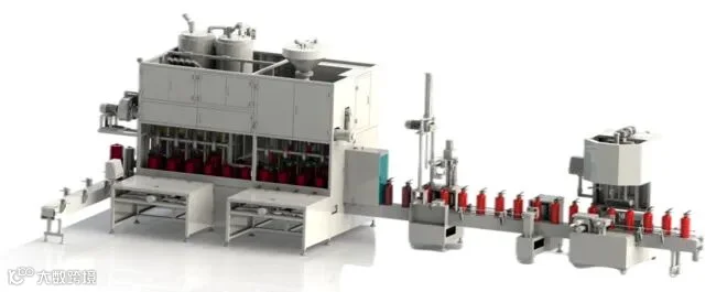 图一所示的八工位干粉灌装设备用于干粉灭火器灌装。包含自动粗灌、精灌、回粉去尘、打孔松粉、瓶口抹油、拧紧把手、充气等功能。由绿博公司自主研发,是目前市场上自动化程度高,精度高的新型设备。