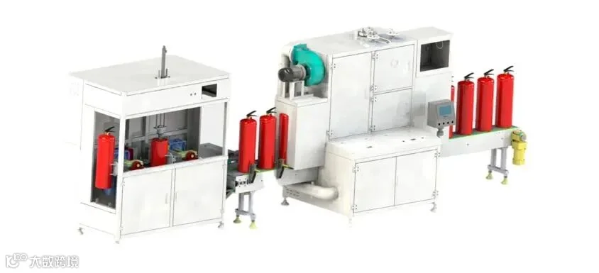 图二所示的翻转振动+智能充气机与器头组装线对接,拧紧器头后的灭火器,从组装线进入本机,灭火器翻转,把虹吸管内的粉和灭火器中的粉震松后,进入智能两工位自动充气机。充气时,摄像头实时监控压力表,并把数据传送到设备自带电脑上。(指针位置用户可自行设定,充气合格率97%)