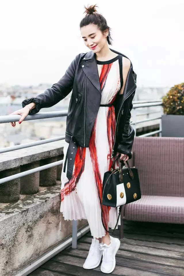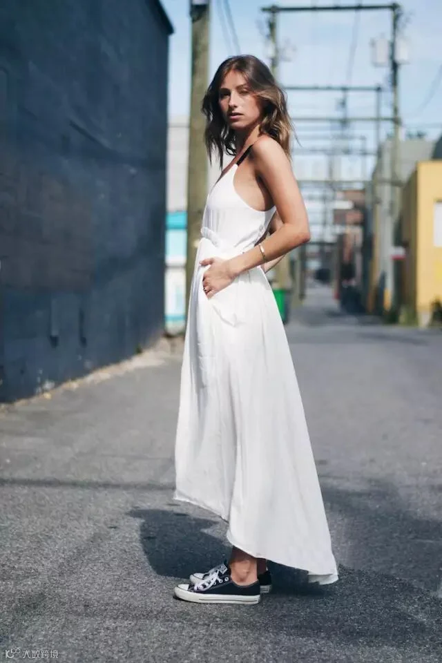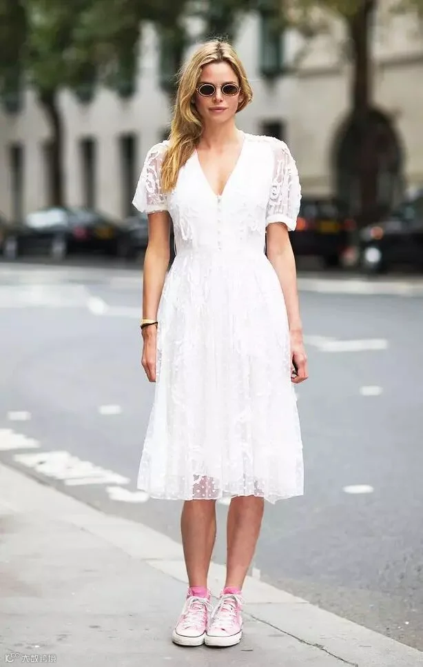 小白鞋简直是现今时尚圈的扛把子,搭配什么都适合,而且风格转变无压力,搭配连衣裙,美炸天~