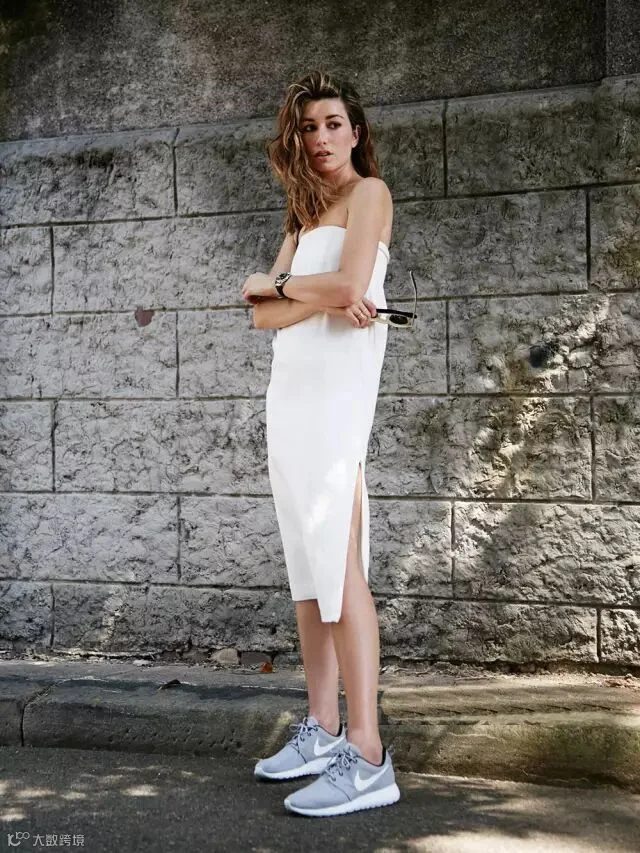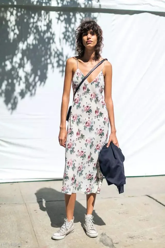 当然除了百搭的小白鞋,各种颜色款式的运动鞋也是搭配利器。比起常规的高跟配连衣裙,