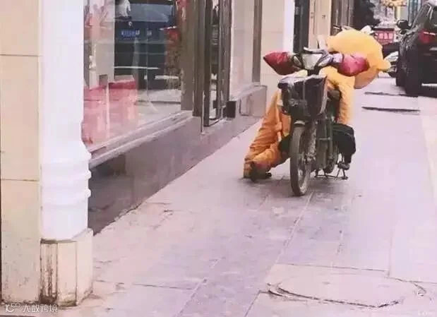 在快餐店里拍到的外卖小哥,