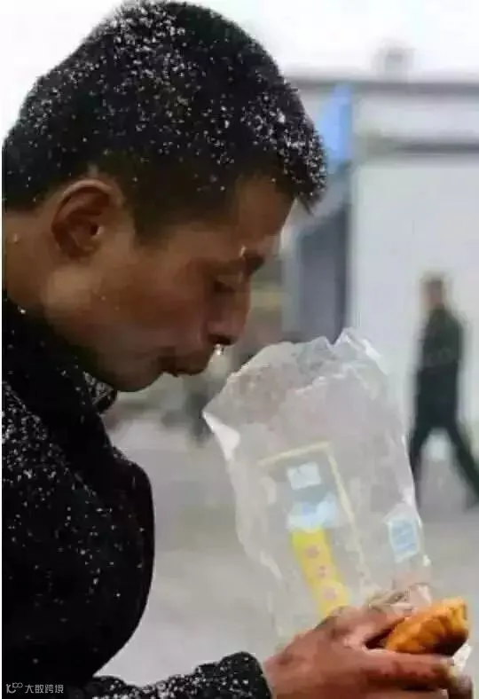 一位农民工顶风冒雪守在火车站等生意。