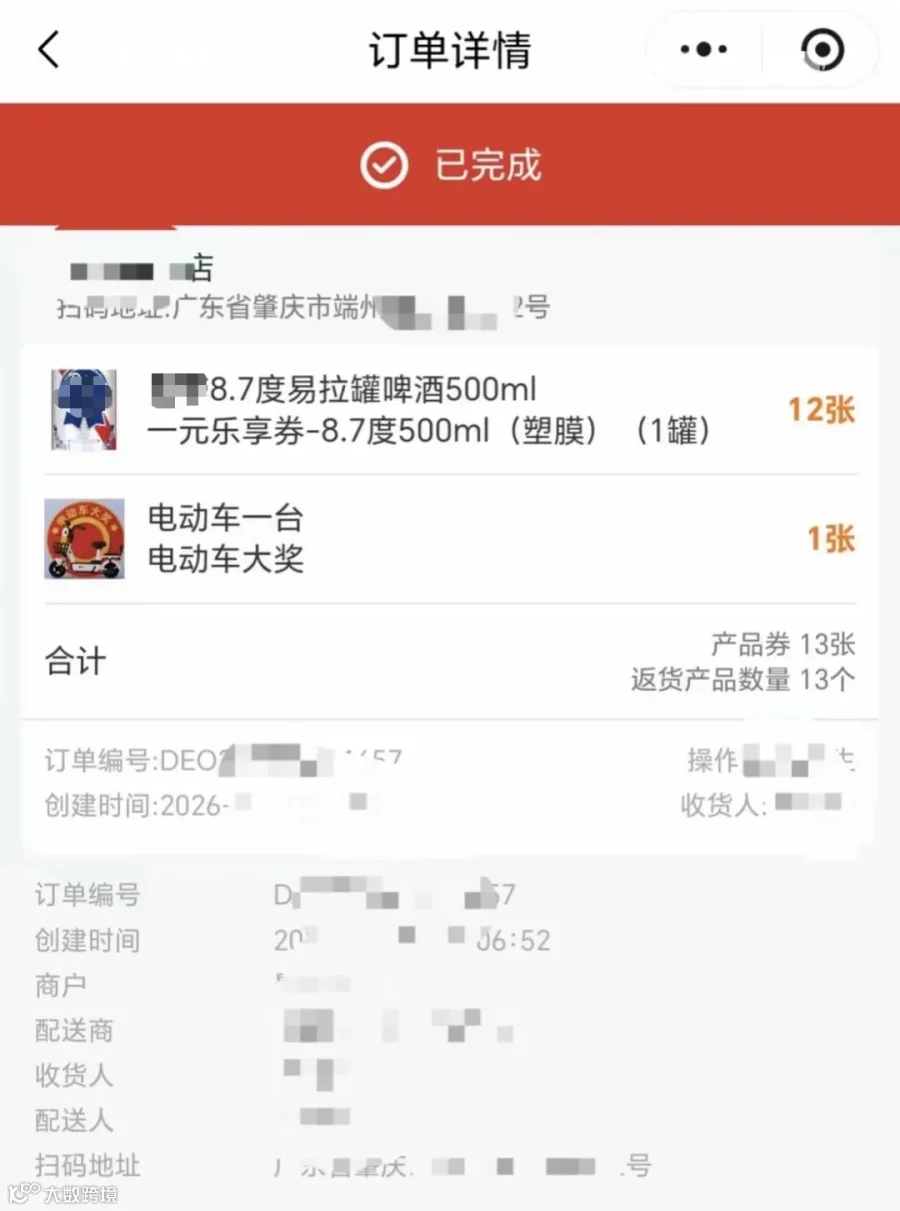 3月23日,广东肇庆一男子喝啤酒时抽中大奖,将二维码发到网上询问真假,配文:是真的吗?厂家请联系我。没想到该二维码竟反被别人抢先核验。