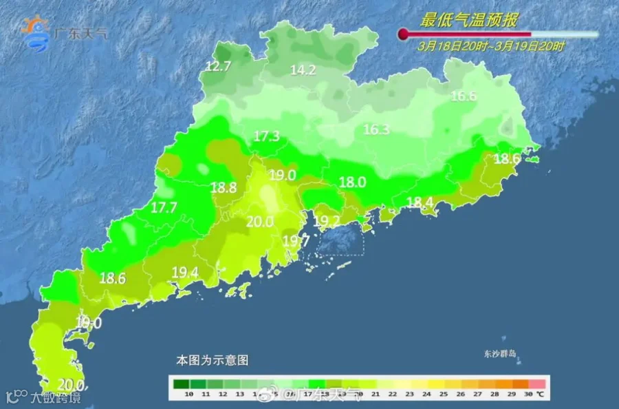 冷空气有是有,就是弱,主要在粤北做点工,气温降多少,主要看“天的脸色”——云量多少:白天云多些,最高气温降一点点,早晨云多了,中南部很多地方的最低气温可能不降反升;