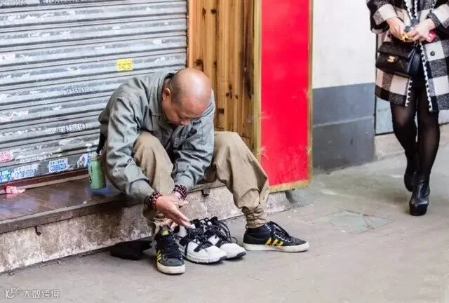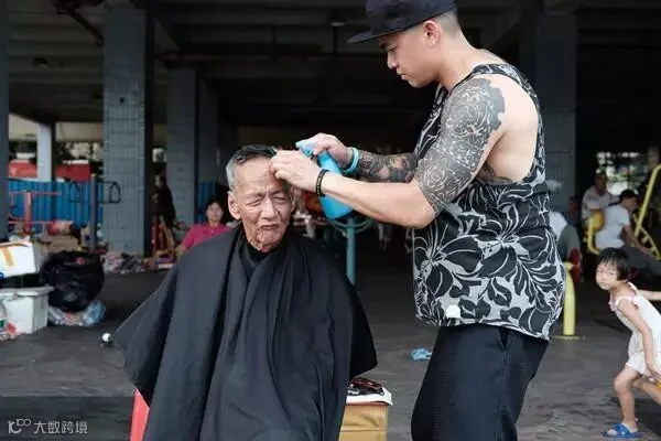 在广州街头为流浪汉理发的纽约花臂少年 Mark Bustos,用他剃头的照片来示意一下