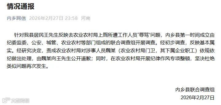 针对我县居民王先生反映去农业农村局上厕所遭工作人员“辱骂”问题,内乡县第一时间成立由纪委监委、公安、城管、农业农村等部门组成的联合调查组开展调查。经初步调查,反映基本属实。