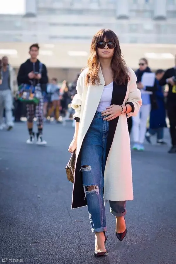 大衣尽量敞开,内搭尽量凸显腰线,踩一双高跟鞋或者马丁靴,再配一个酷酷的单品如手拿包或者墨镜——帅气十足!