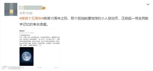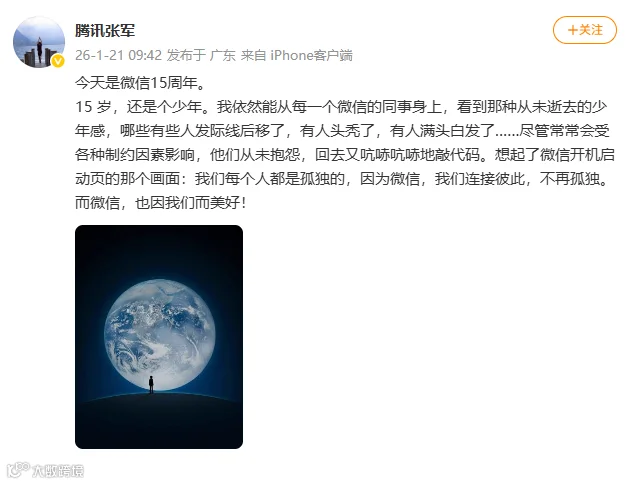 今天是微信15周年。15岁,还是个少年。我依然能从每一个微信的同事身上,看到那种从未逝去的少年感,有些人发际线后移了,有人头秃了,有人满头白发了……尽管常常会受各种制约因素影响,他们从未抱怨,回去又吭哧吭哧地敲代码。想起了微信开机启动页的那个画面:我们每个人都是孤独的,因为微信,我们连接彼此,不再孤独。而微信,也因我们而美好!
