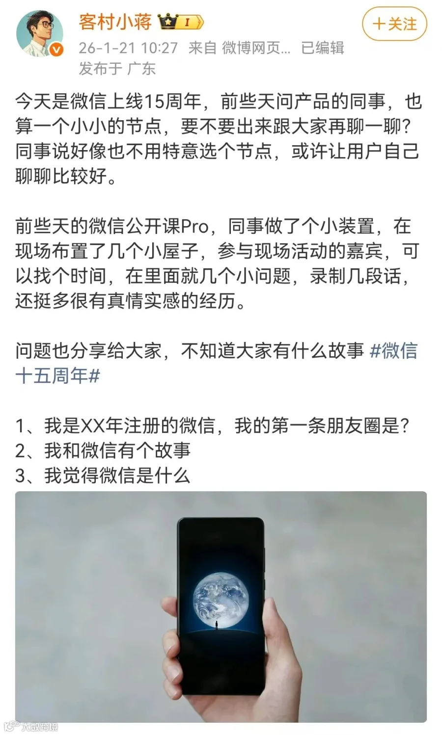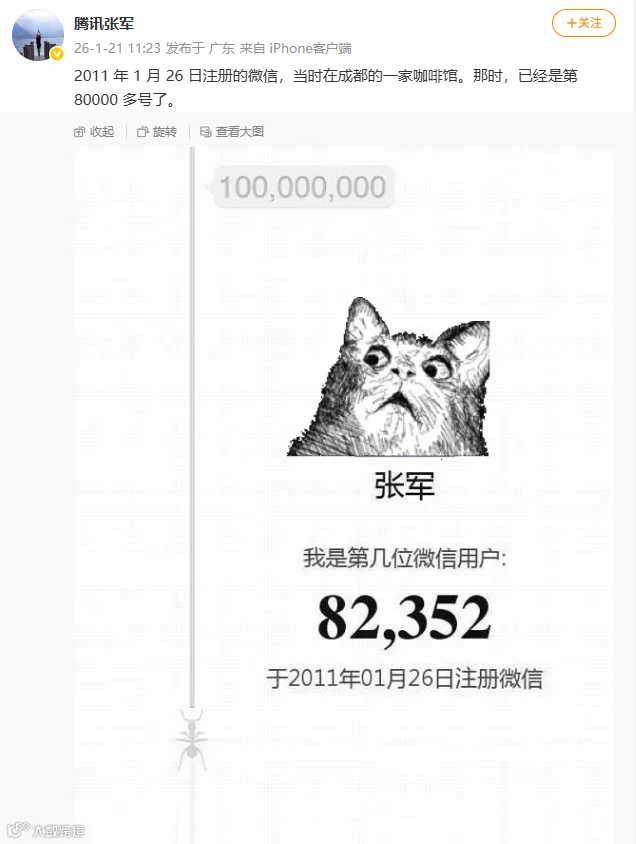 此外,他还分享了自己注册微信的时间,“2011年1月26日注册的微信,当时在成都的一家咖啡馆。那时,已经是第80000多号了。”