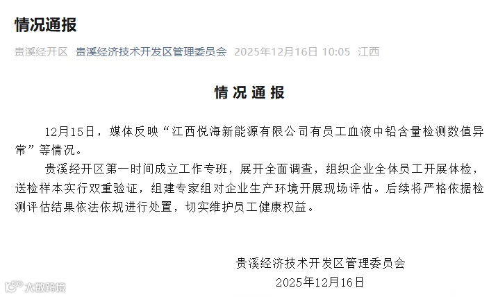 12月16日,江西省鹰潭市贵溪经济技术开发区管理委员会发布情况通报:12月15日,媒体反映“江西悦海新能源有限公司有员工血液中铅含量检测数值异常”等情况。