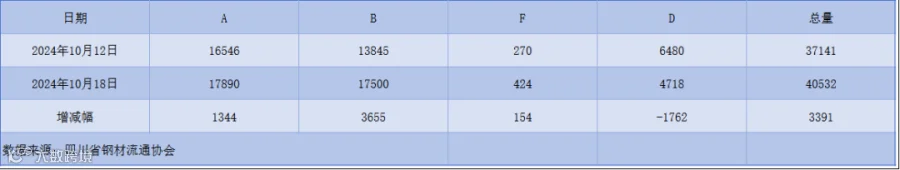 本周四川省钢材流通协会对样本钢厂关于板材出货量统计数据显示,样本库房A出货量17890吨,较上周增加1344吨;样本库房B出货17500吨,较上周增加3655吨;样本库房F出货424吨,较上周增加154吨;样本库房D出货4718吨,较上周减少1762吨;总出货量40532吨,较上周增加3391吨。