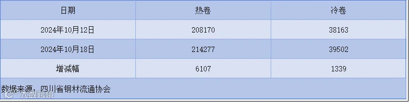据四川省钢材流通协会统计,本周成都地区样本库房中热卷库存量为214277吨,较上周增加6107吨。冷卷库存量为39502吨,较上周增加1339吨。