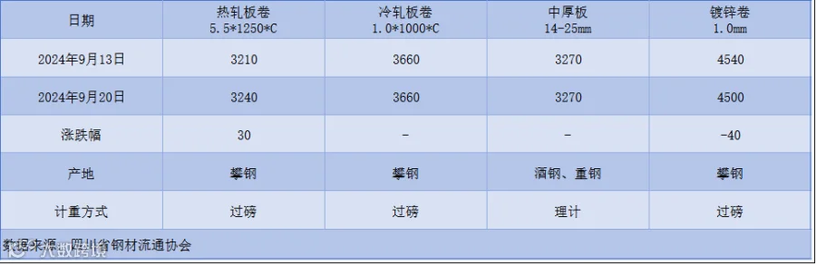 据四川省钢材流通协会对本周成都现货市场监测显示:热轧板卷较上周价格上涨30元/吨;冷轧板卷与上周价格相同;中厚板与上周价格相同;镀锌卷较上周价格下跌40元/吨。