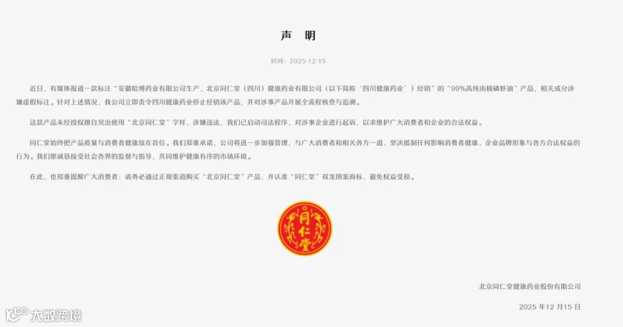 12月20日,中国北京同仁堂微信公众号就南极磷虾油问题发布声明。针对近日有关“南极磷虾油”的舆论关注,同仁堂集团立即开展零容忍品牌严管专项行动,已采取如下措施: