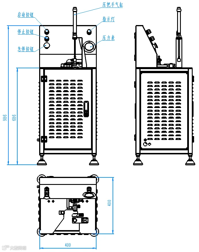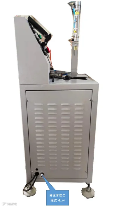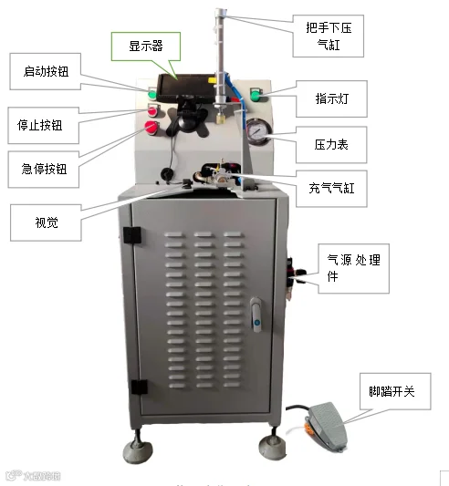 该手动充气机为保证用户使用安全,在灭火器充气时采用相机的形式观看压力表的指针的位置。采用四周钣金防护的形式来确保用户安全。采用橡胶塞自动对阀口,采用气缸自动阀门把手;设备实现半自动化。