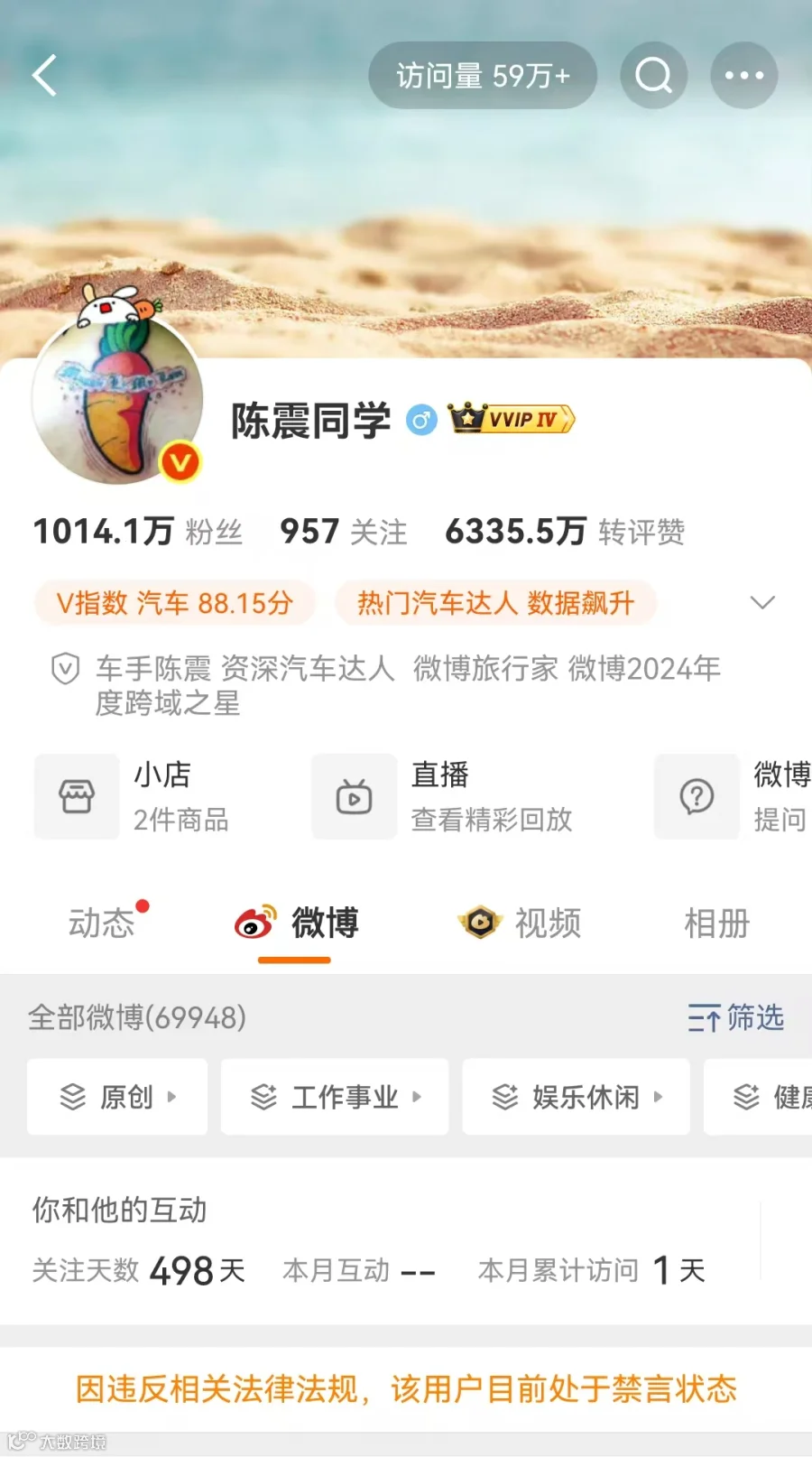 微博平台显示,其账号因违反相关法律法规,目前处于禁言状态。经过统计,陈震全网粉丝超过2400万。