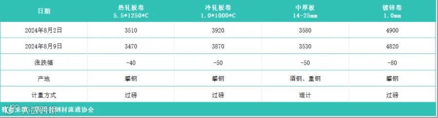 据四川省钢材流通协会对本周成都现货市场监测显示:热轧板卷较上周价格下跌40元/吨;冷轧板卷较上周价格下跌50元/吨;中厚板较上周价格下跌50元/吨;镀锌卷较上周价格下跌80元/吨。