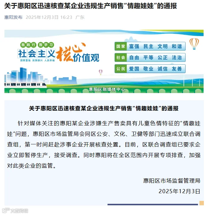 针对媒体关注的惠阳某企业涉嫌生产售卖具有儿童色情特征的“情趣娃娃”问题,惠阳区市场监管局会同区公安、文化、卫健等部门迅速成立联合调查组,第一时间赶赴涉事企业开展核查处置。