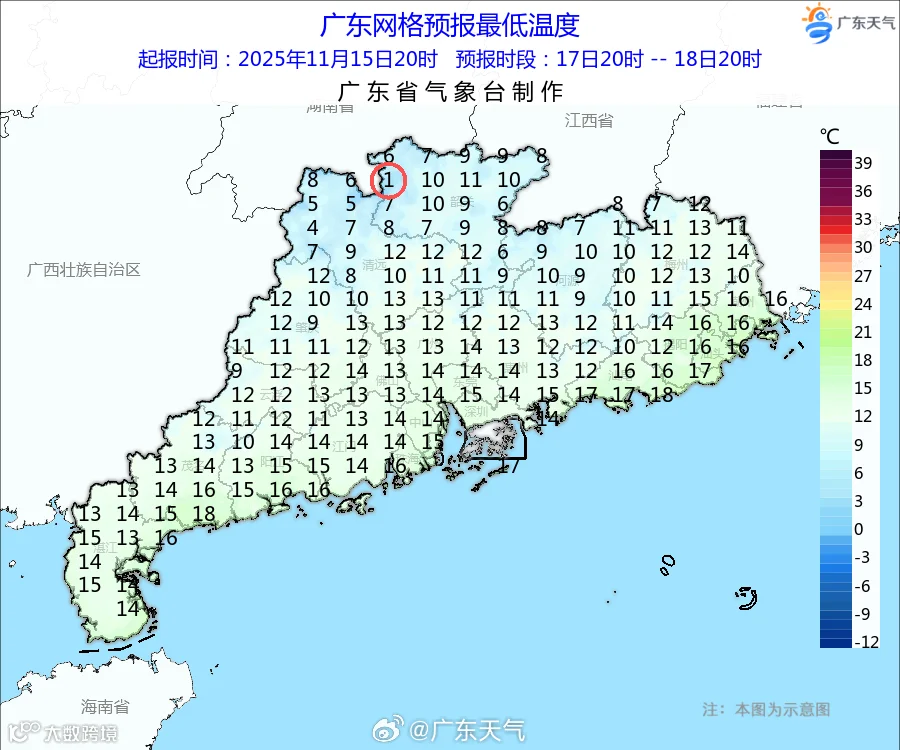 (粤北高海拔山区1℃~3℃)