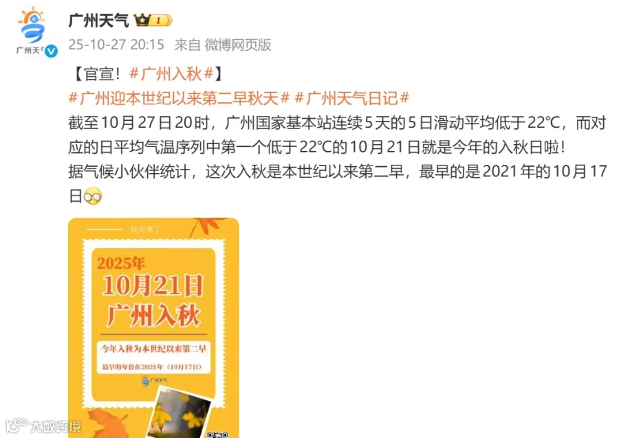 据@广州天气 消息,截至10月27日20时,广州国家基本站连续5天的5日滑动平均气温低于22℃,而对应的日平均气温序列中第一个低于22℃的10月21日即是今年的入秋日。据气候统计,这次广州入秋是本世纪以来第二早,最早的是2021年的10月17日。
