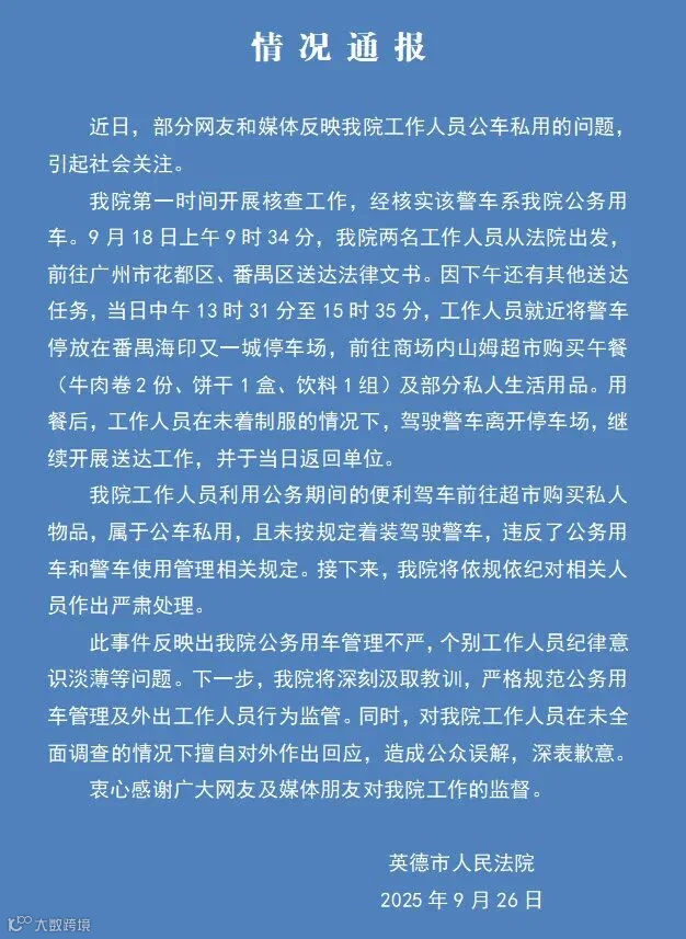 近日有网友反映,一辆粤R(清远)法院警车出现在150公里外的广州山姆,女司机着生活装,被质疑私用公车占用工作时间购物。