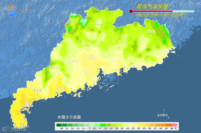 20日,韶关、清远、肇庆多云转中雷雨局部暴雨,雷雨时伴有8-9级短时大风和短时强降水,其余市县多云间阴天有分散(雷)阵雨。最高气温:雷州半岛和东部市县30~32℃,其余大部市县26~29℃。