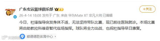 主教练杜锋今日突发身体不适,无法坚持带队比赛,现已前往医院就诊。