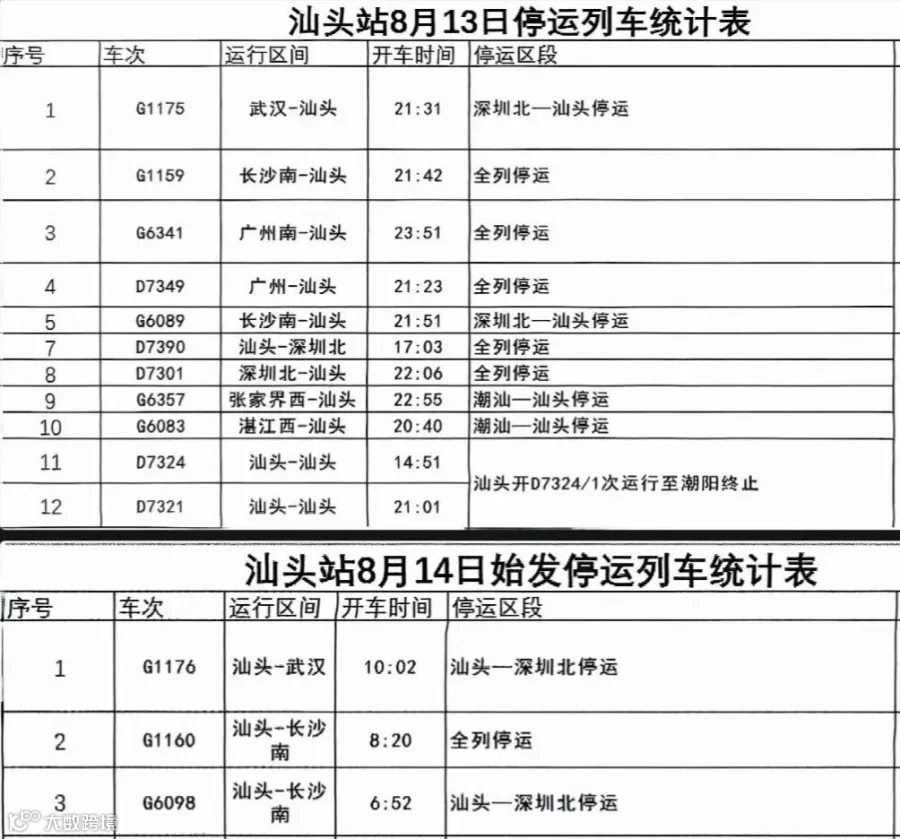 为有效应对台风带来的恶劣天气,铁路部门提前研判风险,计划对部分列车停运或变更运行区段。截至8月12日20点,列车运行调整如下: