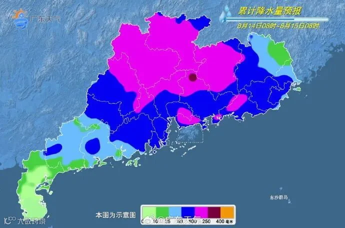 13日夜间-14日夜间,粤东、粤北、惠州北部、广州北部、肇庆北部自东向西有暴雨到大暴雨局部特大暴雨(面上60~120毫米,最大雨量300毫米左右),珠江三角洲其余市县有大雨到暴雨局部大暴雨,粤西市县有中雨局部暴雨。最高气温:粤西市县31~34℃,其余市县普遍介于28~30℃。
