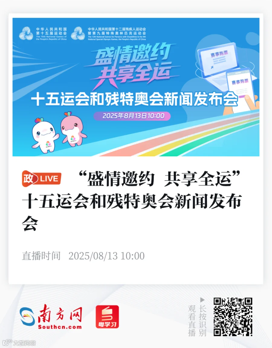 8月13日,“盛情邀约 共享全运”第十五届全国运动会和全国第十二届残疾人运动会暨第九届特殊奥林匹克运动会新闻发布会在广州召开。会上,十五运会组委会、十五运会广东省执委会和十五运会及残特奥会香港赛区统筹办、澳门赛区筹备办负责人介绍粤港澳三地门票销售计划及赛事票务政策,宣告票务系统上线,并回答记者关心的问题。