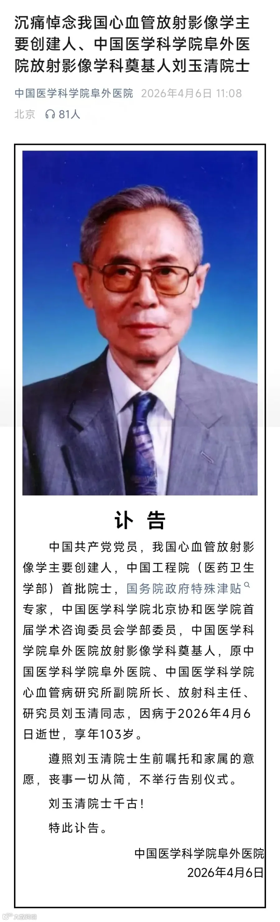我国心血管放射影像学主要创建人,中国工程院(医药卫生学部)首批院士刘玉清因病于2026年4月6日逝世,享年103岁。