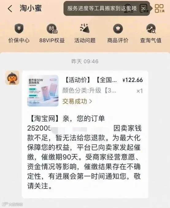 有消费者称,其订单退款流程已卡顿数十天,联系商家也没获得回应,“淘宝客服的回复是卖家钱款不足,暂无法退款,他们正在催缴保证金”。