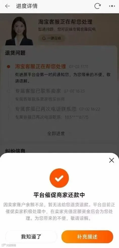 淘宝的官方客服回应,目前核实到商家处于保证金不充足状态。商家产品问题及保证金不足的情况,会向监管部门反馈,由专员对接商家负责人。如果商家保证金充足,会第一时间退款,但尚不确定商家何时能解决资金问题。