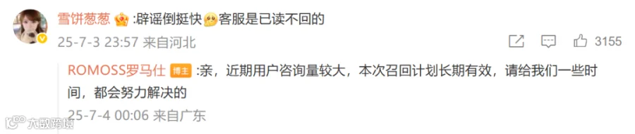 此外,针对网友提出的“客服已读不回”等问题,罗马仕也进行了相应的回答:近期用户咨询量较大,本次召回计划长期有效,请给我们一些时间,都会努力解决的。